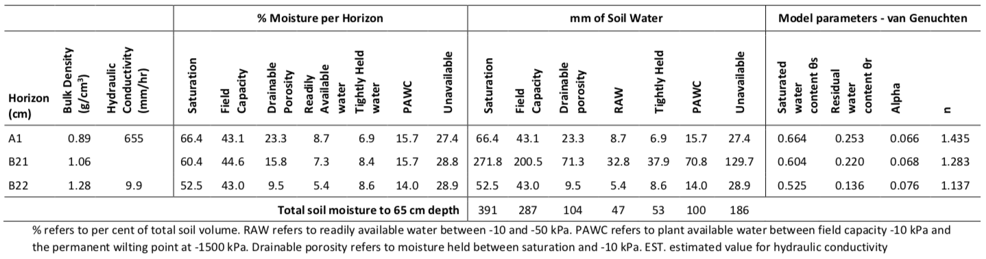 This data reflects both the quality of the soil structure, the amount of water available for growth and the ease by which these soils are able to be irrigated. The data indicates how much water is available for vigorous tree and fruit growth, as well as how much water is available for tree maintenance and survival. This data can also be used to better schedule irrigation, and compare irrigation requirements between soils.